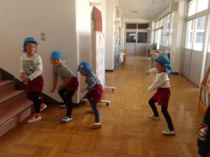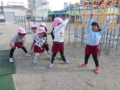終わってから、子どもたちにどうだったか聞いてみると、「かっこよかった!」「すごかった!」と興奮気味の子どもたち。どこがかっこよかったか聞いてみると、「これがかっこよかった!」と小学生の真似をして、足を開いたり手をあげたりして「ドッコイショ」「ソーラン」と言いながら、かわいいソーラン節が始まりました!小学生の姿が刺激になったようです。