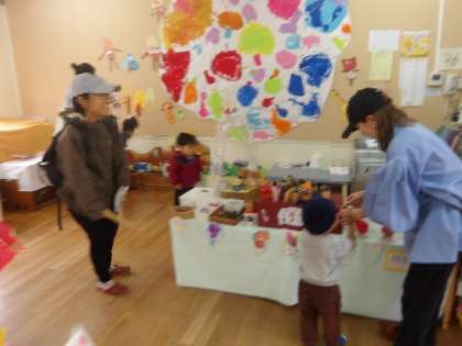 園庭で遊んだあとは、先日、幼稚園で子ども展覧会があったので、子どもたちの作品を見ていただきました。魅力的なアイスやケーキ、ロケットに、小さいお友達も興味津々でした。