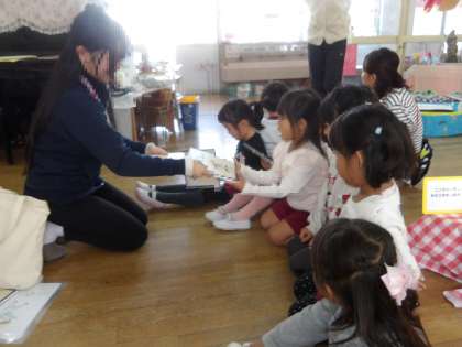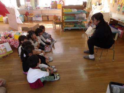 区役所の方が4歳児訪問事業として来園してくださり、さくら組の子どもたちに『ねこすけくん なんじにねたん?』の絵本を読んでくださりました。