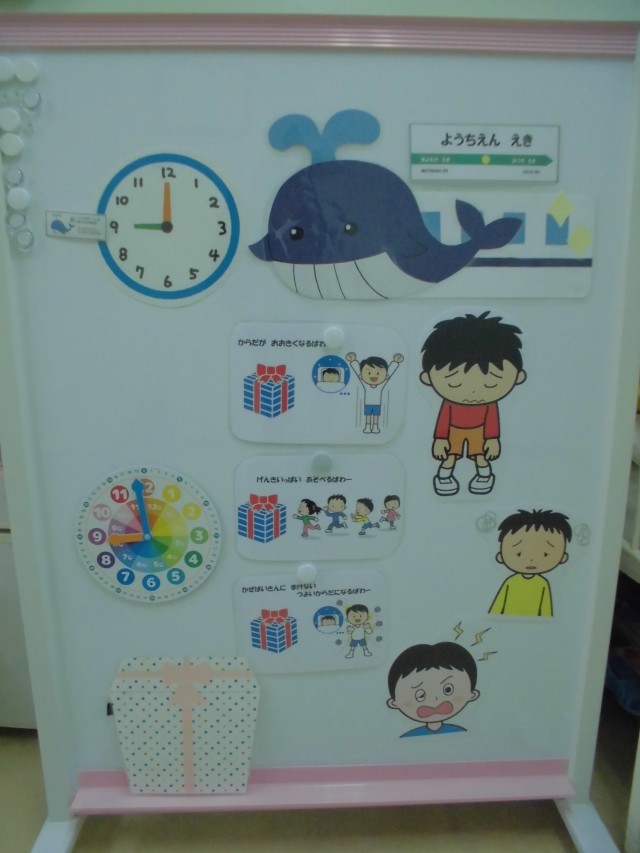 毎日の生活習慣を子どもたち自身にも意識して欲しいと思い、1月は早寝・早起きの大切さについて保健指導をしました。夜9時までに布団に入って休むと、くじら列車が迎えにきてくれて、プレセントにたどり着きます。一方寝るのが遅くなると、くじら列車には乗れず、プレゼントをもらうことができません。プレセントは、頭がすっきりしたり、体を大きく強くしたりするパワーです。