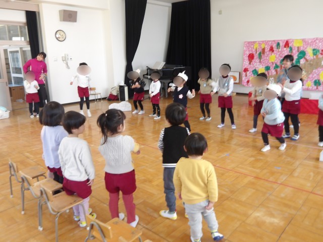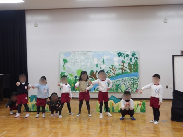 先日の発表会でお家の方に見ていただいた劇遊びを、今日はさくら組、そら組の子どもたちみんなで一緒に楽しみました。