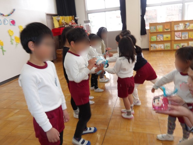 午後からは、今まで過ごした幼稚園中を回りながらゲームを楽しんだり、最後はさくら組さんが、そら組さん一人一人のことを思ってつくったプレゼントを渡しました。