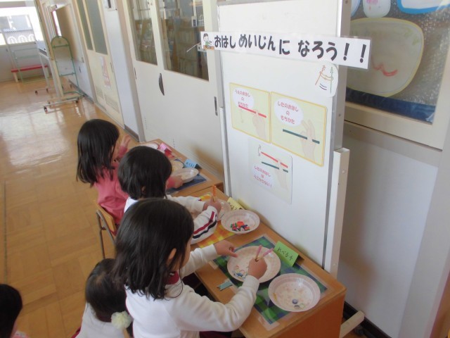 「おはし名人になろう!」というテーマで廊下にお箸のゲームを置いています。