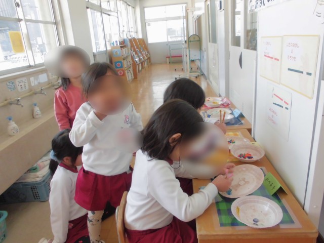 5歳児(そら組)も4歳児(さくら組)もお箸がスムーズに使えるようになってきています。