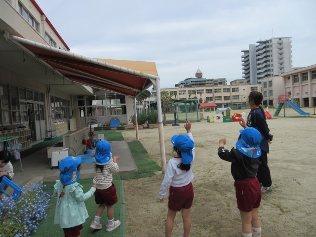 アゲハチョウが、元気に幼稚園の屋根より高いところまで飛んでいき、子どもたちは「バイバーイ!」と見えなくなるまで手を振っていました。