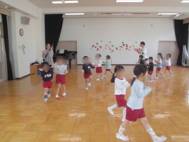 今日の朝まで雨が降っていたので、朝は園庭に遊びに行けなくてちょっと残念な様子の子どもたちでしたが、みんなでお遊戯室に集まると、何するの?とわくわくした気持ちになってきた子どもたち。