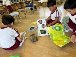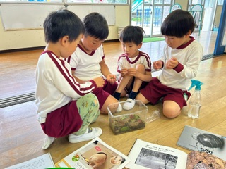 先日からまつ組でダンゴムシを飼い始め、ダンゴムシの本を見ながら脱皮している途中の姿を見つけ知らせ合っていましたよ!