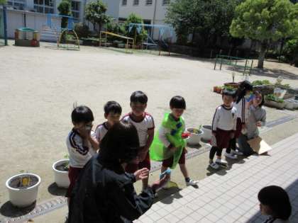 火災を想定した避難訓練をしました。まつ組が素早く避難する姿を、きく組も真剣な様子で見ていました。