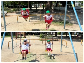 季節のお花であるシロツメクサがたくさん咲いていたので王冠を作ったり、順番にブランコに乗ったりして楽しみました♪