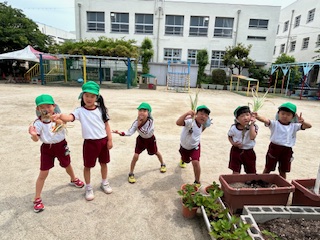 玉ねぎの収穫のとき同様、根っこから匂いがすることに気付いた子どもたちは、きく組の部屋に「匂って〜」と知らせる姿がありました。