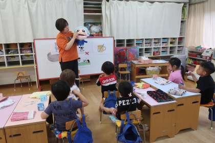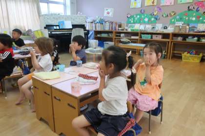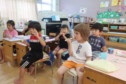 保健指導(きく) 公開日 2024/06/04 更新日 2024/06/04 園行事 歯みがき指導をしました。これまで、きく組はお弁当の後はうがいをしていましたが、今月から食後に歯みがきを始めます。「つるちゃん」と一緒に歯ブラシの持ち方(ペングリップ)や歯みがきの時のお約束を知らせました。その後、音楽に合わせて隅々まで磨きました。お口がさっぱりして、舌で歯を触るとツルツルして気持ちがいいことが感じられた様子でした。おうちでも、朝昼晩の食後に歯みがきをしましょう。 いいね(0)