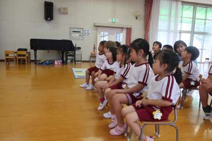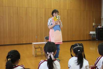 大型絵本やエプロンシアターなどしていただいて、子どもたちは興味津々!