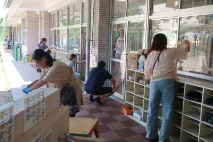 終業式の前にお家の方と一緒に大掃除もしました。普段なかなかできない高いところまできれいにしていただきました。子どもたちも雑巾を絞り、自分の靴箱やロッカーを拭き、「ピカピカになったね」と喜んでいました。