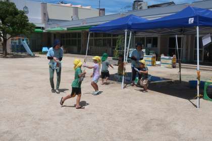 毎日、午前中は泥んこ遊びの服に着替え、水鉄砲や的あてを楽しんでいます。