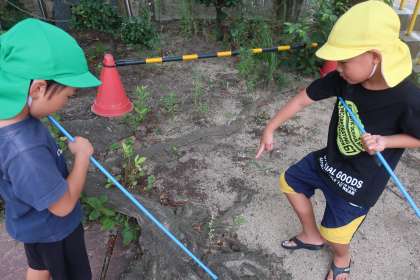 預かり保育の子どもたちはセミの鳴き声に反応し、虫網をもってセミ探しをしています。