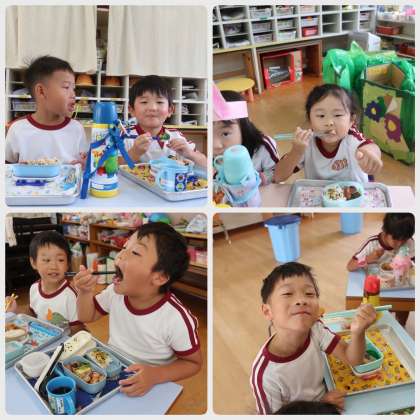 みんなで食べるとおいしいね♪ 公開日 2024/10/08 更新日 2024/10/08 園行事 今日は野菜チャレンジデーでした。ブロッコリーやプチトマト、きのこやサツマイモ、なす、ピーマン、ほうれん草など色々なお野菜が入ってました。苦戦している様子もありましたが、好きなおかずと一緒に食べたり、お友だちに応援してもらったりして頑張ることができていましたよ。たくさんほめてあげてくださいね♪ いいね(0)