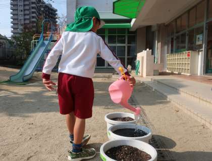 「大きくな〜れ」「いつ咲くかな?」と水やりをしています。