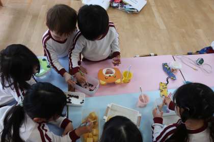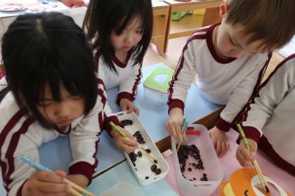 きく組はお弁当の後、お箸でスポンジやお豆を掴んで遊びました。スポンジはすんなり掴めていましたがお豆は滑ってなかなか掴めない様子でした。遊びの中で正しいお箸の使い方を身に着けてほしいなと思います。おうちでも正しくお箸を持つことができているか見てあげてくださいね。