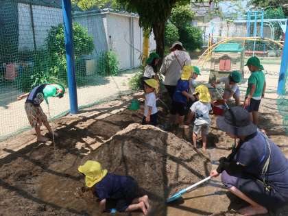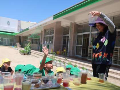 砂場では、「温泉プール」の遊びに夢中になっている子どもたちです。5歳児まつ組の子どもたちが穴を掘ったり、道をつなげたりしてつくったその名も「温泉プール」。そこに水を運んできて流し入れ、4歳児きく組の子どもたちも一緒に楽しんでいます。また、草花を使った色水づくりも、大人気。しっかりと色を出すためにはどうしたらいいのか、5歳児が4歳児に「少しずつ水を入れたらいいよ」と伝え合う姿も見られました。片付け後には、みんなで「おいしそう」「ぶどうジュースかな」と見合いっこをしました。