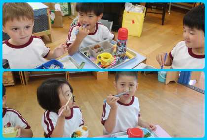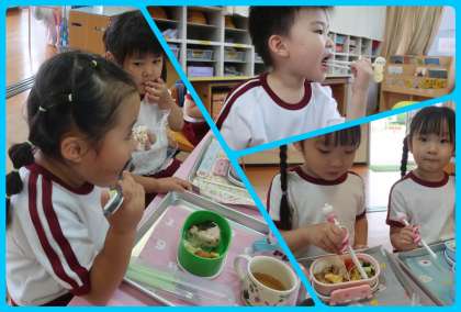 きく組は初めての野菜チャレンジデーでした。「ミニトマトとピーマン入れてもらったよ」「ジャガイモ苦手やけど頑張ってみるねん」と張り切っている子どもたちです。「食べるから見てて!」と自慢げにもぐもぐしている姿はとても微笑ましかったです。おうちでもたくさん褒めてあげてくださいね。オクラにお肉が巻いてあったり、マカロニサラダに人参が入ってあったりと、おうちの方が食べやすいようにと工夫してくださっていたおかげで食べることができていました。ご協力いただきありがとうございました。次回は24日(火)です。