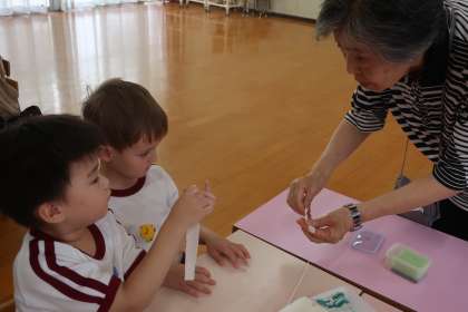 先日、地域の方に来ていただいて七夕に向けてのこより作りをしました。細い紙をひねってこよりを作りました。さすが地域方たちはとてもお上手で、子どもたちは「どうやったらそんなに細くなるの?」と教えてもらいながら一緒に作りました。七夕飾りも一緒に作り楽しいひと時を過ごしました。暑い中来ていただき、ありがとうございました。