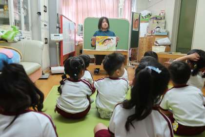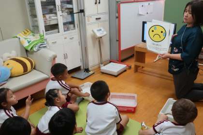 熱中症について保健指導をしました。きく組は「あついひのおともだち」の紙芝居を読みました。主人公の女の子が汗をたくさんかいている様子をみて「帽子かぶってないよ」「お茶飲まないと」とすぐ気づいていました。お外で遊ぶときは、帽子をかぶる・お茶を飲む・日陰で遊ぶようにして熱中症を予防しようねと話をしました。まつ組は、汗の役割や水分補給についての話をした後、熱中症についてのクイズをしました。熱中症にならないために、のどが渇く前に水分補給をすることや肌着の重要性もお話ししました。子どもたちが暑さ指数を意識できるように、今日から、各保育室の廊下に暑さ指数を掲示しています。玄関には保育後の暑さ指数を掲示していますので、降園後もこまめな水分補給などを行い熱中症予防に努めましょう。
