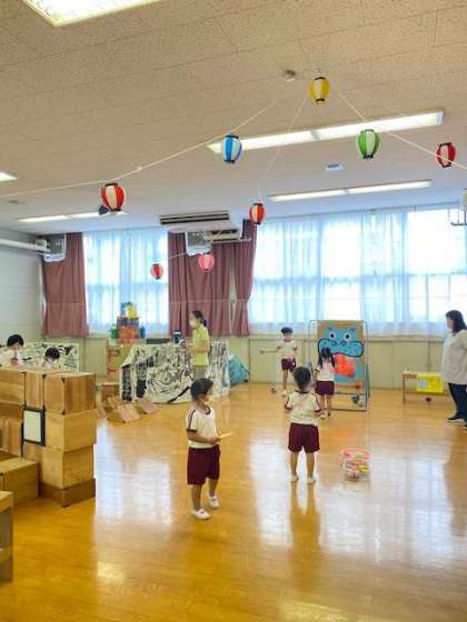 これまで、みんなで遊びながら何度も試行錯誤を繰り返し、つくってきました。子どもたちで作りあげた「つるのこまつり」。今日は、提灯が飾られた夏祭りの楽しい雰囲気の中で、みんな目一杯遊びました。最後にはお土産もあり、みんな大喜びです。