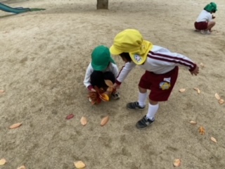 「落ち葉が散るよゴーゴーゴー」歌いながら拾い、紅葉してる葉っぱを見つけて、「綺麗な葉っぱ見ーつけた♪」と嬉しそうでした。