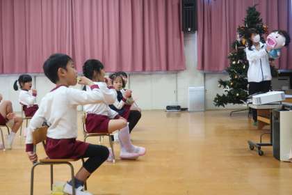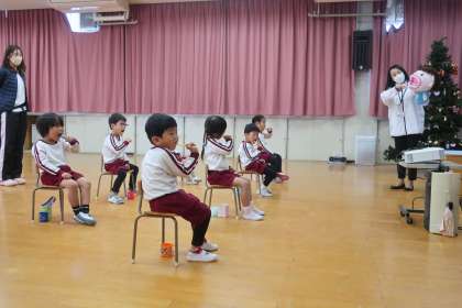 きく組には、「なぜ虫歯になるのか」「歯をいつみがくのか」「歯ぶらしの持ち方」「歯みがきの時の約束」などの話をしていただきました。