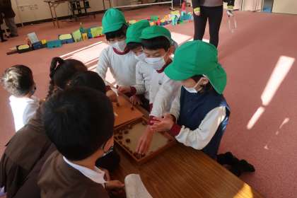 こまやボーリング、けん玉、やじろべい等ドングリや松ぼっくりを使ったたくさんのおもちゃがあり、はじめは緊張していたまつ組でしたが、次第に緊張がほぐれ「もっとやってもいい?」と楽しんでいました。