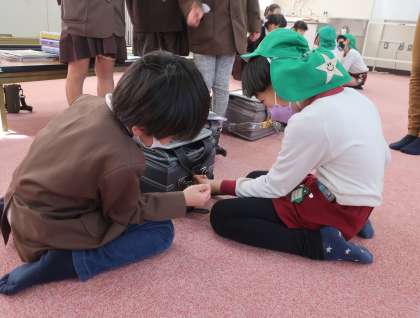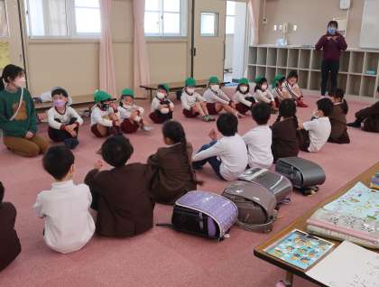 国語、算数、音楽の時間のほかに給食の準備の仕方、掃除の仕方、ランドセルの扱い方を教えてもらいました。「わかる!!」と嬉しそうにクイズに答える姿や「ランドセル似合うね」と言われて誇らしげな表情などが見られました。