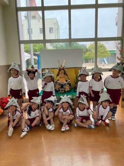 実際に五月人形を見ながら、「つのみたいなのがある!」「戦いでかぶるやつや!」と話しながら・・・