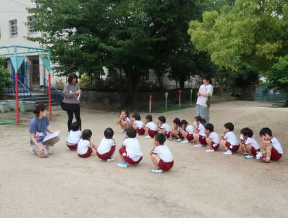 火災を想定した避難訓練を行いました。今回はきくぐみも実際に園庭に避難しました。みんなハンカチで口、鼻をおおい静かに落ち着いて避難することができました。園長先生から「お・は・し・も」のお話を聞き、各クラスでも担任の先生からお話がありました。