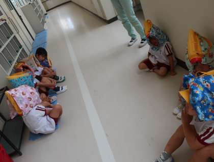 子どもたちは、防災頭巾をかぶり素早く落ち着いて避難することができました。