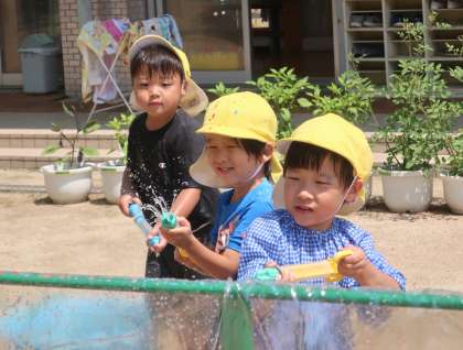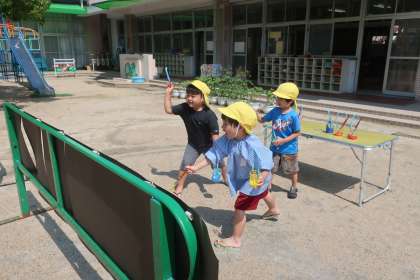 子ども達と園庭で絵具遊びをしたり水鉄砲をしたりして遊びました。
