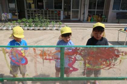 「外でかいていいの?!」「水いっぱい入れてしよ!」と園庭で絵具を使う楽しさや水の心地よさを感じ、心を開放して存分に外で遊びました。