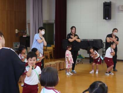 まずは、鶴橋幼稚園が毎年行ってきた『スマイル音頭』をみんなで踊って、お祭り気分は最高潮!!