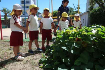 きくぐみは、さつまいもの様子を見に行きました。たくさん葉っぱが茂り、つるもニョキニョキと伸びてきました。