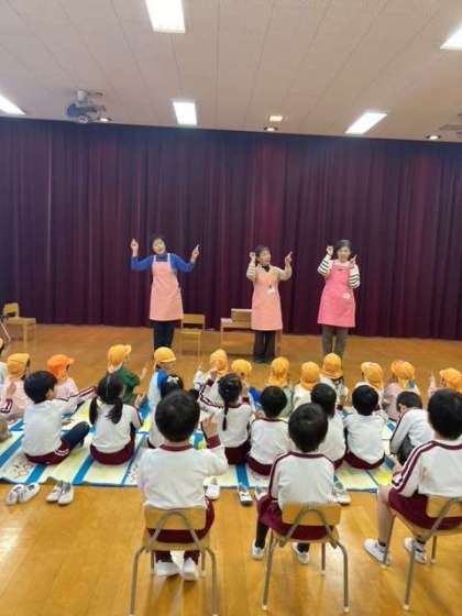 紙芝居や絵本、エプロンシアターを見て、笑ったりいっしょに掛け声を合わせたりして楽しいひとときでした。