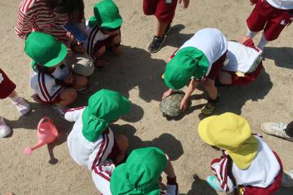 とってもいいお天気で体を動かすと暑いぐらいでした!かめさんも池から出て、広い園庭をお散歩です♪