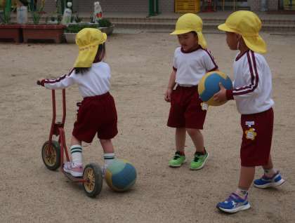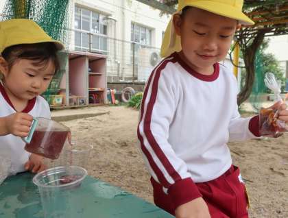 今日も過ごしやすいお天気だったので、たくさん体を動かして遊びました。お花を集めて色水を作ったり、遊具や砂場で遊んだりしました。明日もいっぱい遊ぼうね♪