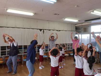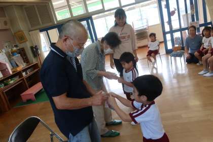 今日はふれあいの日の集いで、祖父母の方や地域の方に来ていただき、一緒に遊びました。お手玉をしたりコマ回しを教えてもらったりしました。一緒にふれあい遊びをして子どもたちも大喜び!最後には子どもたちが作った壁掛けをプレゼントしました。「いつまでも元気でいてね」「これからも見守っていてね」という気持ちを込めて作り、渡すことができました。楽しいひと時を過ごすことができました。ありがとうございました。