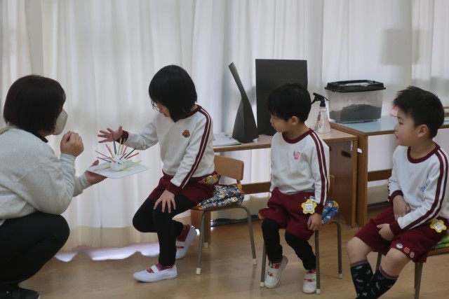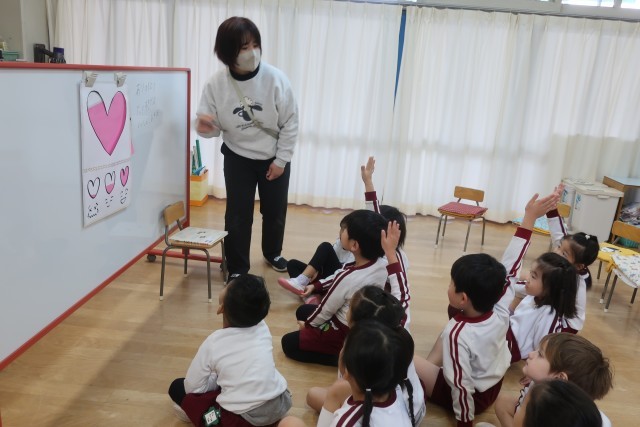 「ふわふわことば・ちくちくことば」について保健指導をしました。まず、「気持ち」をハートで表したものを見せ、ちくちく言葉を言ったり言われたら嫌な気持ちや悲しい気持ちになってハートが少なくなってしまうこと、逆にふわふわ言葉を言ったり言われた時の気持ちはどうなるかをみんなで考えました。また、ふわふわ言葉の「ふわふわ」を体感できるように、やわらかい物を触ってみました。「気持ちいい」「ずっと触っていたい」などと顔にすりすりしたり、ぎゅっと抱きしめたりとみんなニコニコ笑顔でした。次に、「ちくちく」を体感しました。「針みたい」「少し痛い」「怖いから触りたくない」となんだか困った顔でした。そして、まつ組は「ふわふわことば・ちくちくことば」きく組は「そらまめくんのベッド」を読みました。最後に、ふわふわ言葉を出し合いました。「ありがとう」「かっこいいね」「手伝おうか」「貸してあげるね」「大好き」・・・などたくさん出ました。まだまだありそうなので、ふわふわ言葉をみつけたら教えてねと伝えました。早速、お弁当の時間に「これもふわふわ言葉だね」と教えてくれた子がたくさんいました。子どもたちから出た「ふわふわことば」は保健室前に掲示しています。増えていくのが楽しみです!私たち大人も、ふわふわ言葉を使うように心がけたいですね。