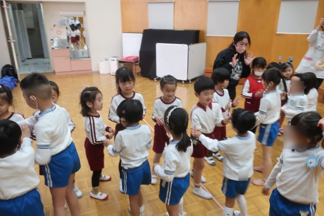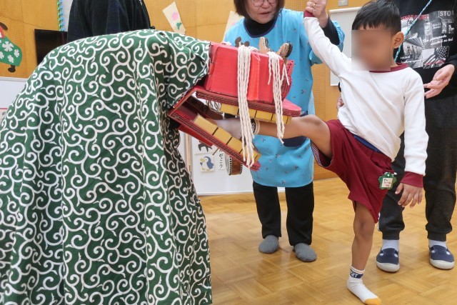 5歳児まつ組の子どもたちが、今年度、3回目の「なかよし会」に参加し、生野聴覚支援学校のお友達との交流を楽しんできました。これまでは2度、鶴橋幼稚園に来てくれたぺんぎん組とつばめ組のお友達。今日は、まつ組が支援学校に行かせてもらいました。初めは、少し緊張気味の様子が見られていましたが、挨拶を交わして互いの歌を聴き合い、次第に笑顔が見られていました。すると、なんと、そこへやってきたのは獅子舞。獅子舞の舞を見せていただき、そして、それぞれに足や頭を嚙んでもらって、願い事をさせてもらいました。そのあとは、かるたやすごろくなどのお正月遊びを一緒にして、あっという間の楽しい時間に、お別れが名残惜しい子どもたちでした。また一緒に遊びたい気持ちや小学生になってもがんばろうねの気持ちを伝え合い、最後に力強くタッチを交わしていました。生野聴覚支援学校のお友達、先生方、ありがとうございました。