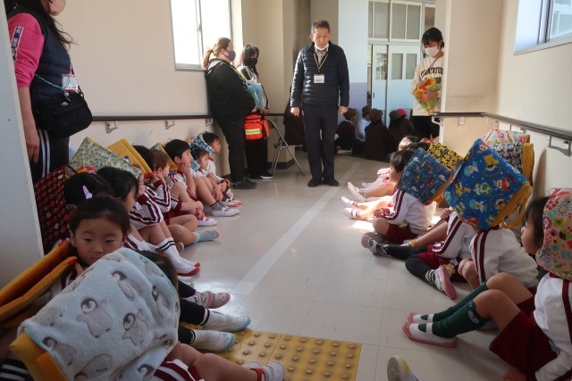 地震・津波を想定した避難訓練をしました。放送をよく聞いて、すばやく机や椅子の下にもぐった後、園庭に避難しました。その後、津波警報が発令されたことを想定し、鶴橋小学校の3階へ二次避難をしました。校長先生からもお話を聞きました。帰園後、各クラスで阪神淡路大震災の話にも触れ、もしも地震が起きた時は落ち着いて先生の話をよく聞き、行動することの大切さを伝えました。