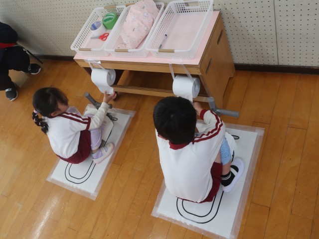 和式トイレについて保健指導をしました。学校や公共施設ではまだ和式トイレを使用する場面があります。いざという時に困らないよう正しい姿勢や使い方を知らせました。初めに、しゃがむ姿勢に慣れるため、ゲームをしました。しゃがんだまま進んだり姿勢を維持することが難しい様子でしたが、最後までゴールすることができました。その後、足を置く場所や姿勢を一緒に確認しました(ズボンの上からズボンを着用して行いました)指導後、実際に幼稚園のトイレに行き、和式トイレの場所を確認したり、使用したりしました。昨年も指導したので「思い出した」「できたよ」と嬉しそうな子どもたちでした。その後も、和式トイレを積極的に利用する姿がみられるようになりました。素敵な小学生に一歩近づいたまつ組でした♪