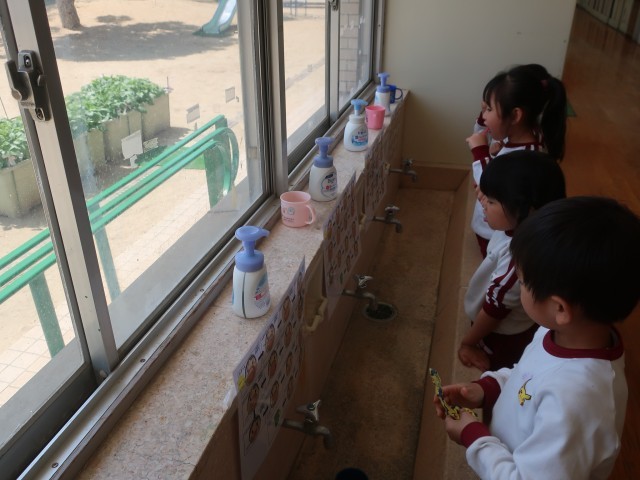 まつ組になって初めての発育測定でした。きく組が「どんなことをしているのかな?」と保健室に来た時も、「痛くないよ」「大丈夫だよ」声をかけてくれる優しいお兄さんお姉さんのまつ組の子どもたちです。発育測定の後に歯みがきについて保健指導をしました。これまでは、昼食後、養護教諭が個別に指導しながら行っていましたが、まつ組になってからは、食べ終わった人から手洗い場へ行き、歯みがきの手順を見ながら歯みがきをします。これからも安全に気をつけて丁寧に歯みがきができるようしていきたいと思います。