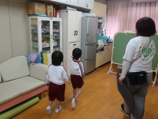 幼稚園で初めての発育測定をしました。「どんなことをするのかな?」とドキドキしている子どももいましたが、まつ組に手伝ってもらい測定しました。その後、保健室クイズをしました。保健室が少しドキドキするお部屋だった子どもも、クイズに答えながら保健室で過ごすことができていました。1学期は検診や測定などで保健室に来る機会が増えますが、安心して受けることができるようにしていきたいと思います。