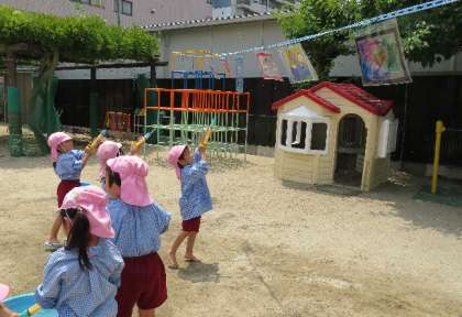 水鉄砲や、スーパーボールすくい、お家から持ってきていただいた素材もつかって、たくさん遊びました。