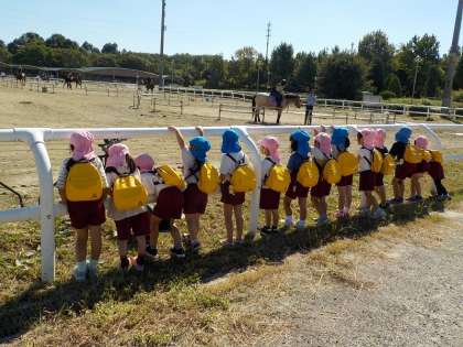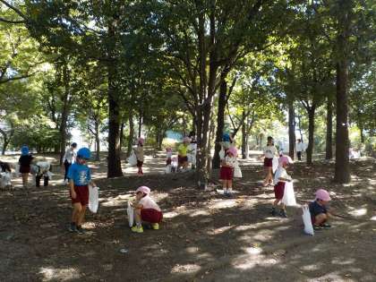 園外保育☆鶴見緑地公園 公開日 2022/10/14 更新日 2022/10/14 お知らせ 今日は、鶴見緑地公園にお散歩に行きました。 「ちっちゃいドングリ!かわいい」「あっ!帽子がついたドングリ」「大きいドングリ見つけた」と言いながら、みんなでドングリをたくさん拾いました。 赤や黄色の葉っぱが落ちていて、みんなで秋の訪れを感じてきました。 最後は、お馬さんに会いに行きました。「こっち向いてる!」と、大喜びでした。 いいね(0)